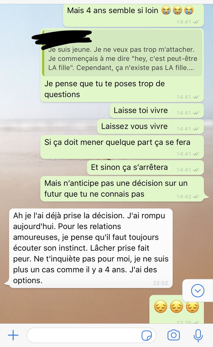 Et puis au bout dun mois et demi il a préféré arrêter car il ne savait plus ou il en était et souhaitait donner une chance a son couple avec elle car il ne voulait pas le regretter plus tard. À long terme cela peut devenir un problème majeur dans la relation car il reste peu de place pour les choses personnelles.