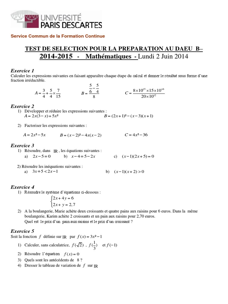 Les tests de positionnement seront donc a effectuer à distance avec un smartphone ou un ordinateur Contenu des tests de positionnement 1h par matière. Test dentrée Epreuve de français Durée. TEST DE SELECTION POUR LA PREPARATION AU DAEU B Mathématiques Exercice1 Calculer les expressions suivantes en faisant apparaître chaque étape du calcul et donner le résultat sous forme dune fraction irréductible.