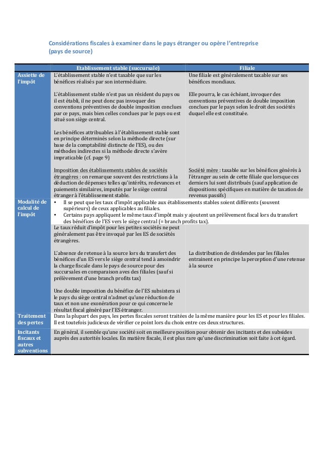 Fiscalement la filiale est elle-même imposable. Cest essentiellement ce qui la distingue de la succursale. Elle est soumise à limpôt sur le bénéfice du pays dans lequel elle est implantée en tant que résidente.