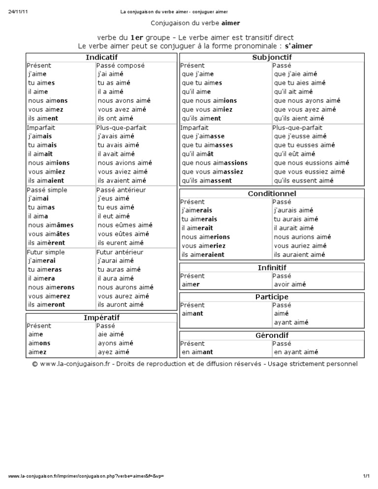 Toute La Conjugaison Verbe Aimer Conjugaison Et Exercices